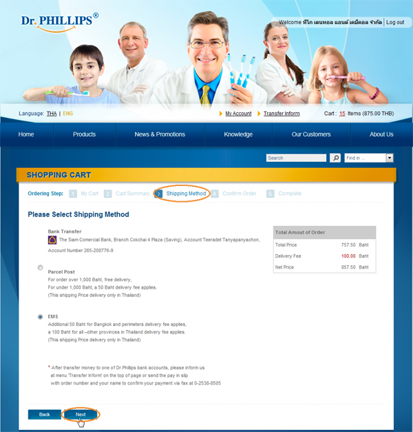 9. You will enter "Shipping Method" screen that show transferable bank, shipping method (view more detail at "Term & Conditions") ,and total amount including transfer fee, The next step is click at "Next"