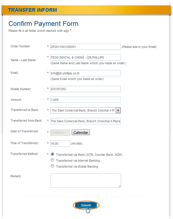 2. You must input transfer detail to us, even Order Number (Can see in your mail) , Name-Lastname, email, Amount (if you're member, some data will show automatically) , When input data completely, The next step is click at "Submit"