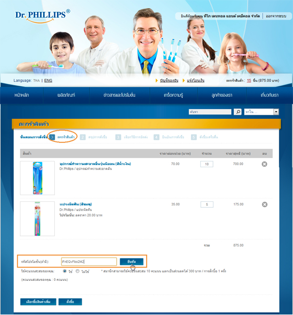 วิธีการใช้ส่วนลดจากคะแนนสะสม 1. ในขั้นตอน "ตะกร้าสินค้า" ด้านล่างจะมีส่วนของ การใช้คะแนนสะสม (เฉพาะสมาชิกเท่านั้น) และจะแสดงคะแนนสะสมปัจจุบันที่มีอยู่ (ตรวจสอบรายละเอียดเพิ่มเติมที่ "สิทธิประโยชน์") ให้ทำการเลือกใช้คะแนนสะสม และกดที่ปุ่ม "สั่งซื้อ" เพื่อไปยังขั้นตอนถัดไป
