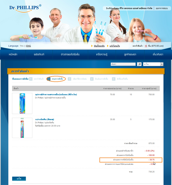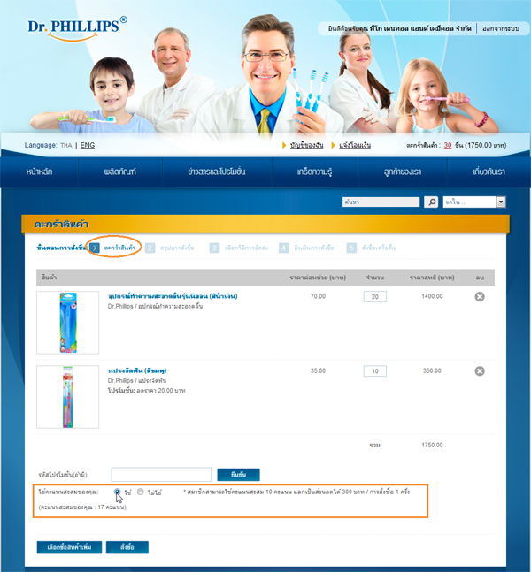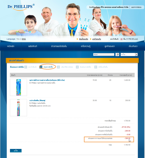 2. เมื่อเข้าสู่หน้าจอ "สรุปการสั่งซื้อ" จะมีการแสดงส่วนลดที่เกิดจากการใช้คะแนนสะสม โดยมีเงื่อนไขว่าการสั่งซื้อครั้งนั้นต้องมากกว่า 1,000 บาท จึงจะสามารถใช้คะแนนสะสมได้