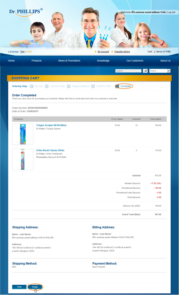 11. You will enter "Complete" screen that show all detail again and Order Number that use for transfer money (view more detail at "How To Transfer Money") and you can print order detail by click at "Print" or click at "Complete" to back "Products" screen