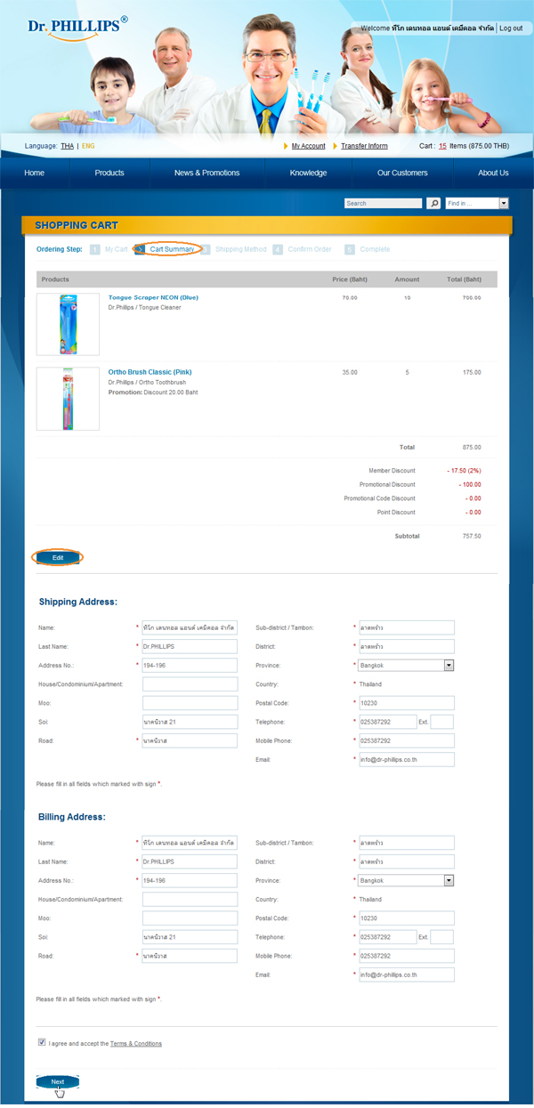 8. You will enter "Cart Summary" screen that show item list and total amount including discount, Your shipping address and billing address will show automatically (you should input real email cause you can tracking your order status), The next step is click at "Next"