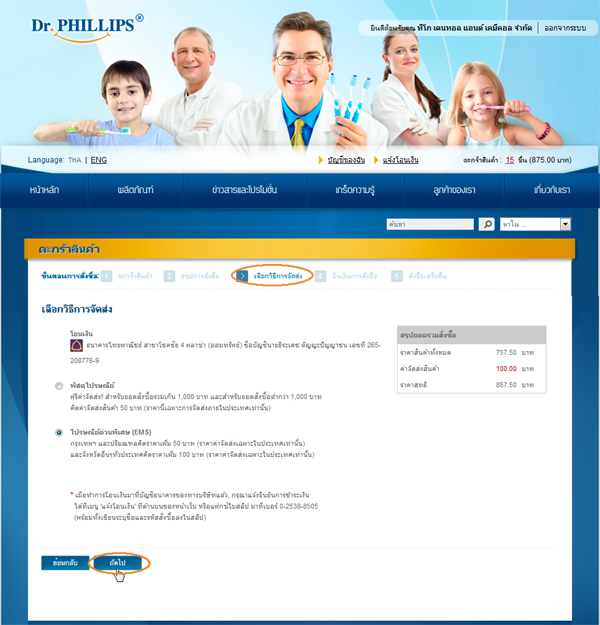 9. จะเข้าสู่หน้าจอ "เลือกวิธีการจัดส่ง" เพื่อแสดงธนาคารที่สามารถโอนเงินได้ และวิธีการที่ต้องการให้บริษัทจัดส่งสินค้า (ตรวจสอบได้ที่ "ข้อตกลงและเงื่อนไขในการสั่งซื้อ") รวมไปถึงแสดงราคาสุทธิ ที่รวมค่าจัดส่งสินค้า ถ้าหากต้องการไปยังขั้นตอนถัดไปกดที่ปุ่ม"ถัดไป" หรือกดปุ่ม "ย้อนกลับ" เพื่อกลับไปยังขั้นตอนที่แล้ว