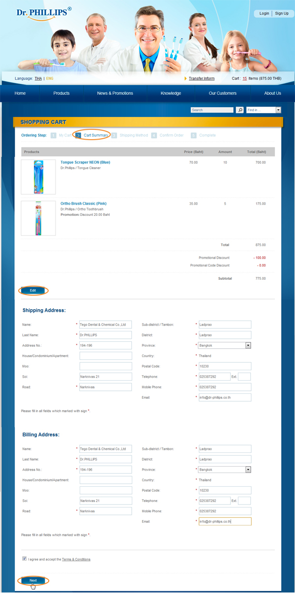 6. You will enter "Cart Summary" screen that show item list and total amount including discount, you need to input address for shipping and billing (you should input real email cause you can tracking your order status), The next step is click at "Next"