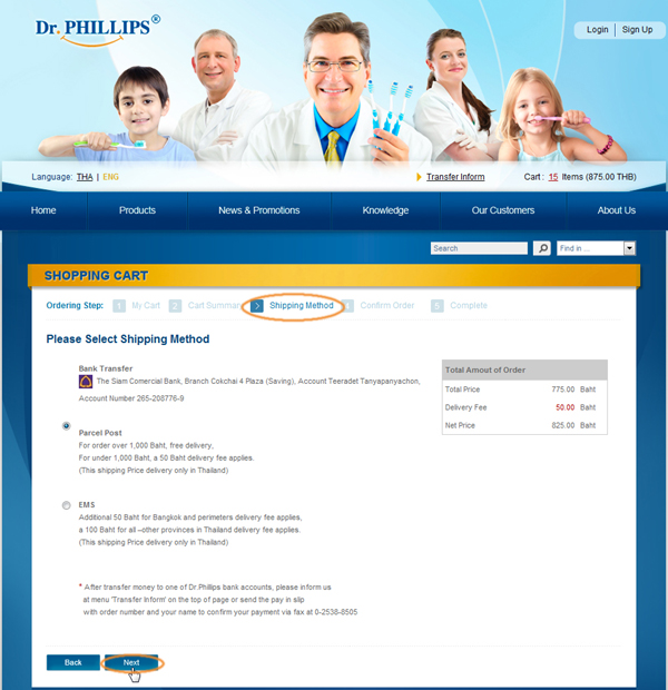 7. You will enter "Shipping Method" screen that show transferable bank, shipping method (view more detail at "Term & Conditions") ,and total amount including transfer fee, The next step is click at "Next"