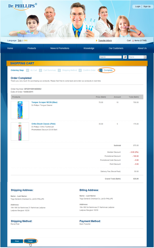 9. You will enter "Complete" screen that show all detail again and Order Number that use for transfer money (view more detail at "How To Transfer Money") and you can print order detail by click at "Print" or click at "Complete" to back "Products" screen