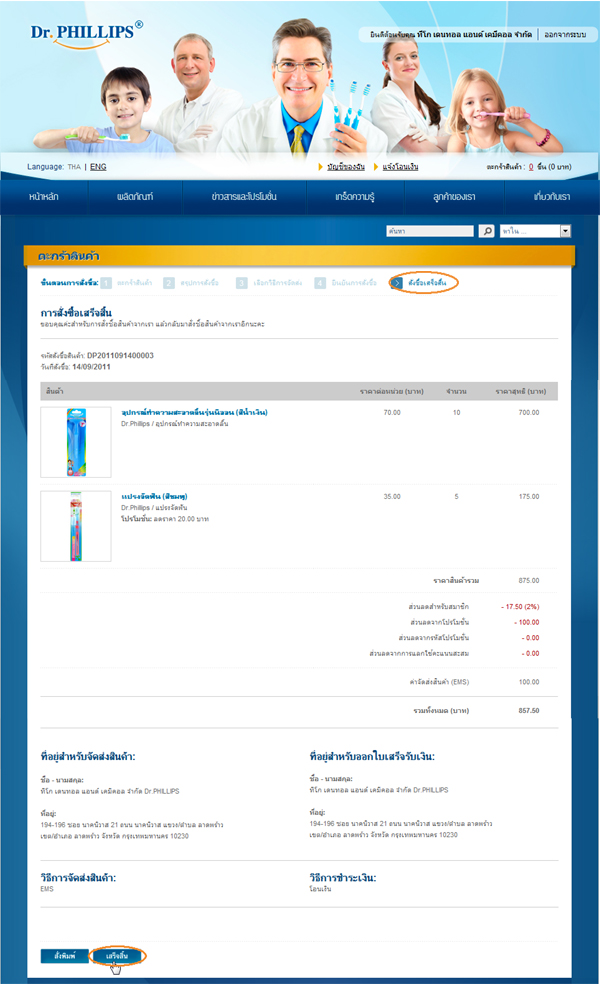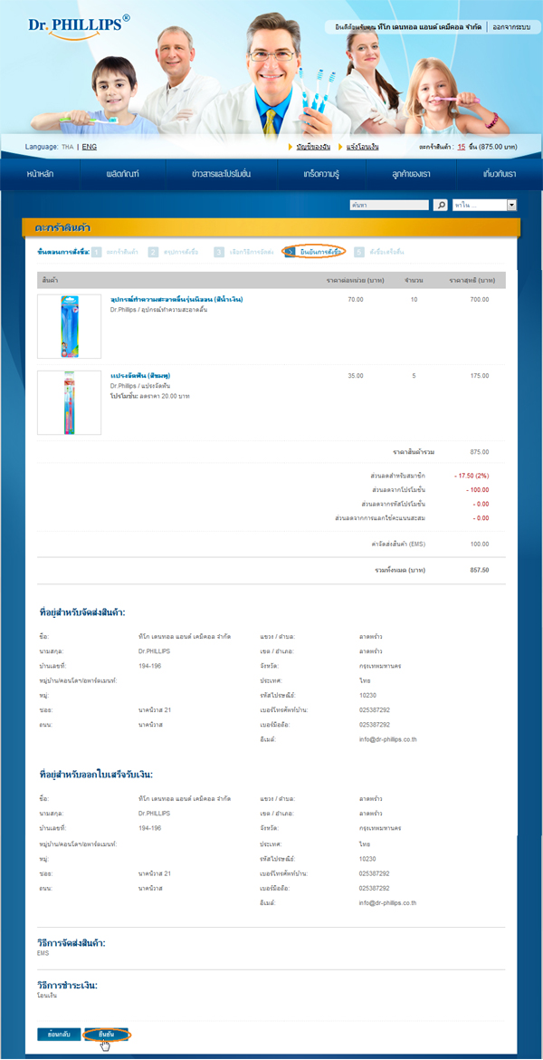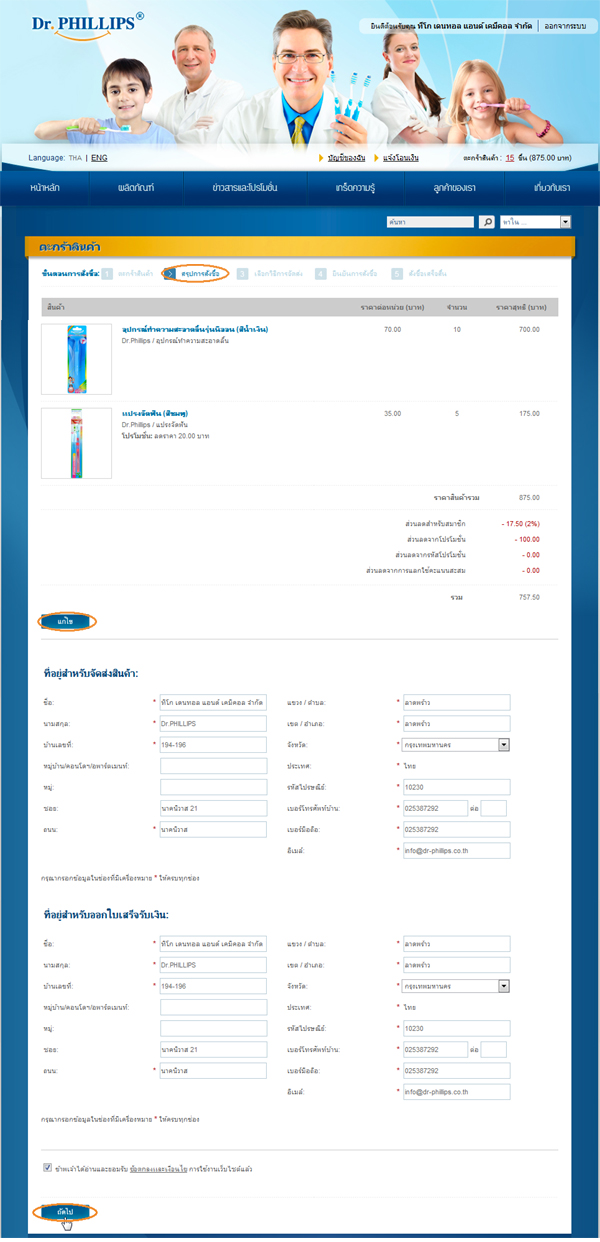 "สรุปการสั่งซื้อ" เพื่อแสดงรายการสั่งซื้อ พร้อมทั้งราคารวมและส่วนลด ระบบจะทำการกรอกรายละเอียดที่อยู่สำหรับจัดส่งสินค้า พร้อมทั้งที่อยู่สำหรับออกใบเสร็จรับเงินโดยอัตโนมัติ